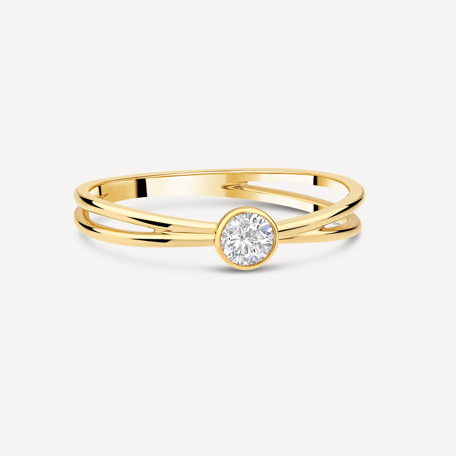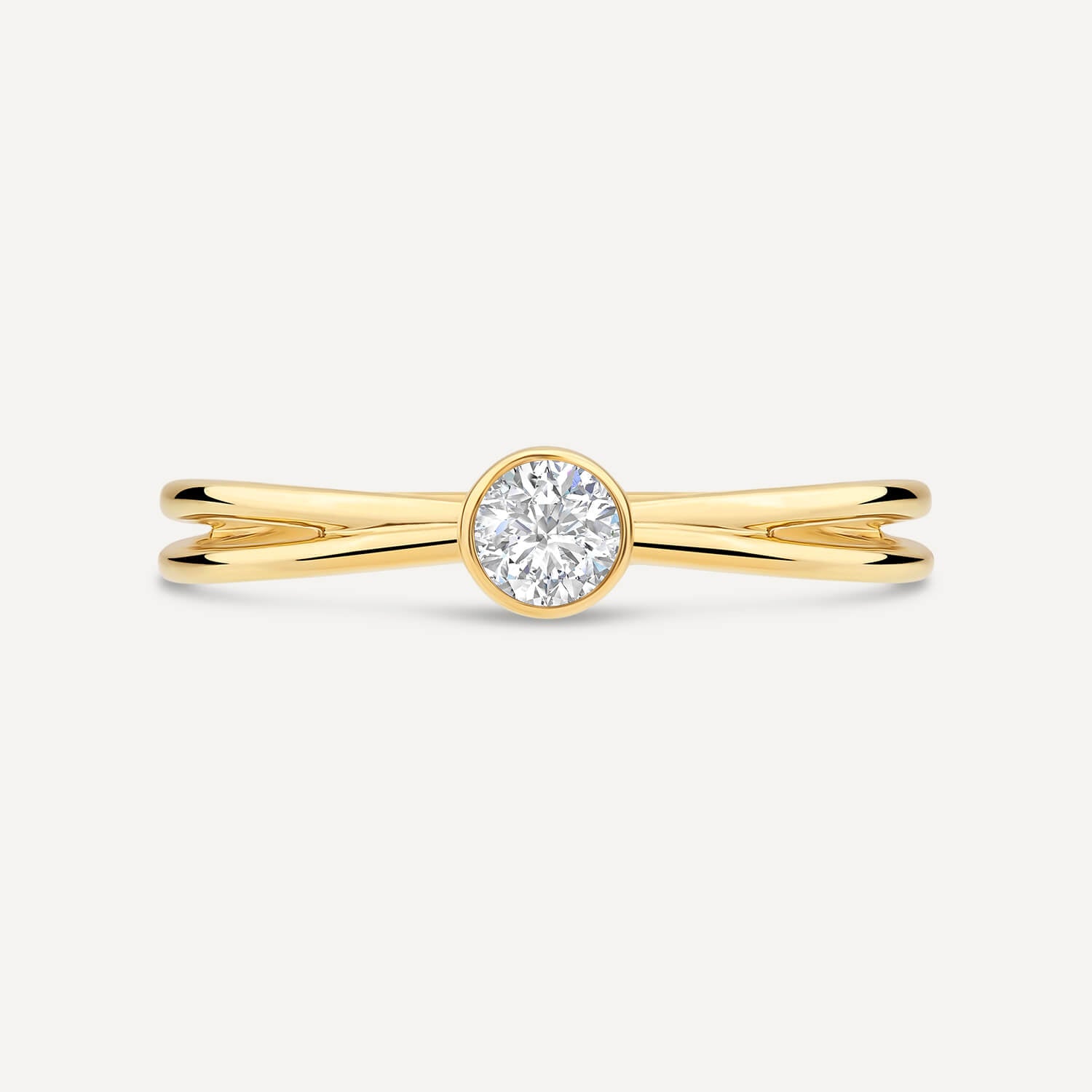 This 9ct yellow gold ring from born™ Kissed with Diamonds features a 0.15ct round lab grown diamond and an open split-shoulder band. Light and easy to wear, it offers just enough detail to stand out without overcomplicating the look. Great solo or stacked.